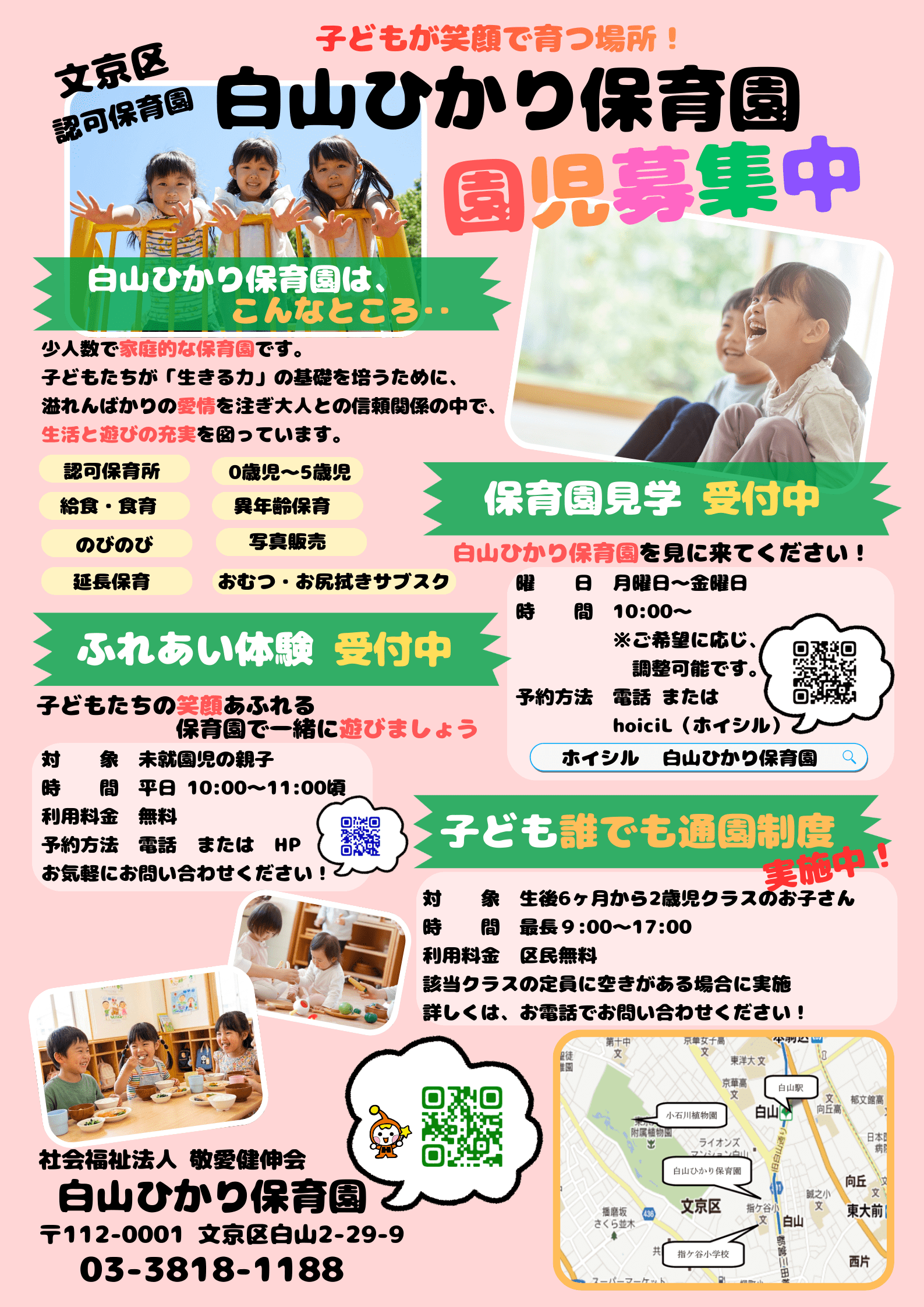 子ども誰でも通園制度受付開始 子ども誰でも通園制度の受付を開始しています。お電話お待ちしています! →画像はこちら By hakusan | 2026年03月23日 | 保育園からのお知らせ | ← もちつきのお知らせ