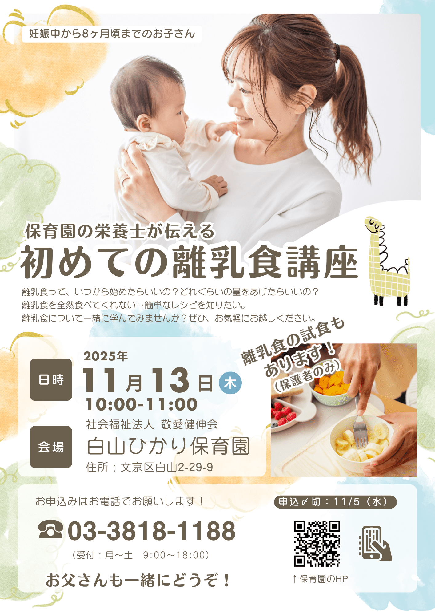 離乳食講座のお知らせ 離乳食はいつから始めたらいいの?離乳食を全然食べてくれない・・・など。 離乳食に関するあれこれを、保育園で一緒に学んでみませんか? ぜひ、お気軽にご参加ください! By hakusan | 2025年10月16日 | 保育園からのお知らせ | ← 保育園に遊びに来ませんか~お楽しみ会~